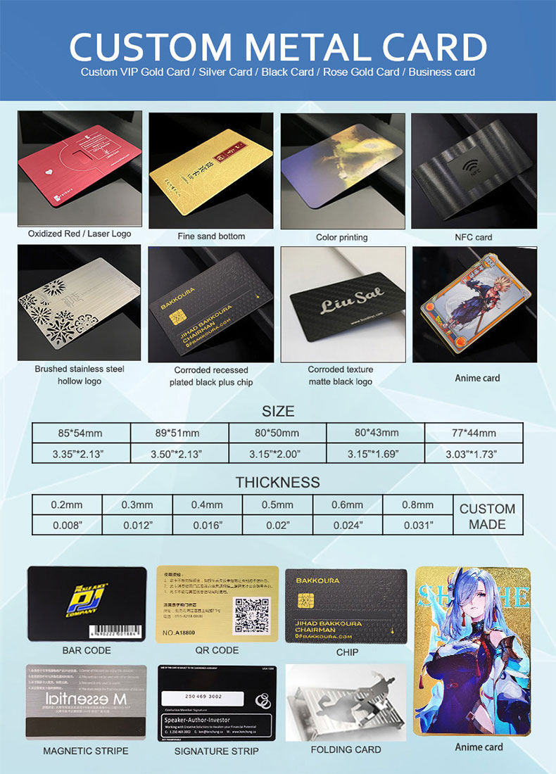 1.Chips can be placed inside,OEM&ODM Available 2. Magnetic strip(Loco: 300oe, hico:2750oe/4000oe) 3.Round,square,or according to customers 4. Signature panel and scratch panel 5.Chemical etching,stamping 6. Brushed, glossy, polished, textured, solid brass 7. Etching, gold/silver plating, engraving, laser, carving,embossing, hollow out 8. personalization: thermal print Card Number, member name & expiry date etc. |